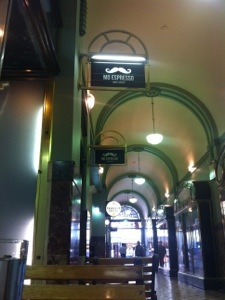 Tucked away in the grandeur of the Trinity Arcade is this dithyramb of moustache and coffee. Why? Who knows, but can’t help thinking there’s one too many E’s and spaces in the smart name. The very interesting 5 Senses Crompton Road blend makes an appearance here, along with a blend for black brews only. There are better draws of Crompton Road around town, but this is a very tasty. Take a seat on Tom Selleck’s face and enjoy the sophistication. 76%