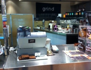 Tucked away along the Carillon walkway, skulking unfashionably closed to the big end of town, in a corner on a bend we find Grind Espresso. The location has all the potential to an alternative super hip underground coffee destination – subway vibe, out of the way, the office desk jockeys scurry along with their heads lowered, unable to spare even a cursory sideways glance at a coffee shop that probably deserves better. Take a seat and the hyper echo of the concrete tunnel accentuates the passing conversations, buffeting your own with a rudely challenging air. Sad, really, ‘cos the brew is OK really. Nice and hot, not sure of the beans, but tastes Fiori-esque. Can’t help thinking it’s missed a styling opportunity 53%
